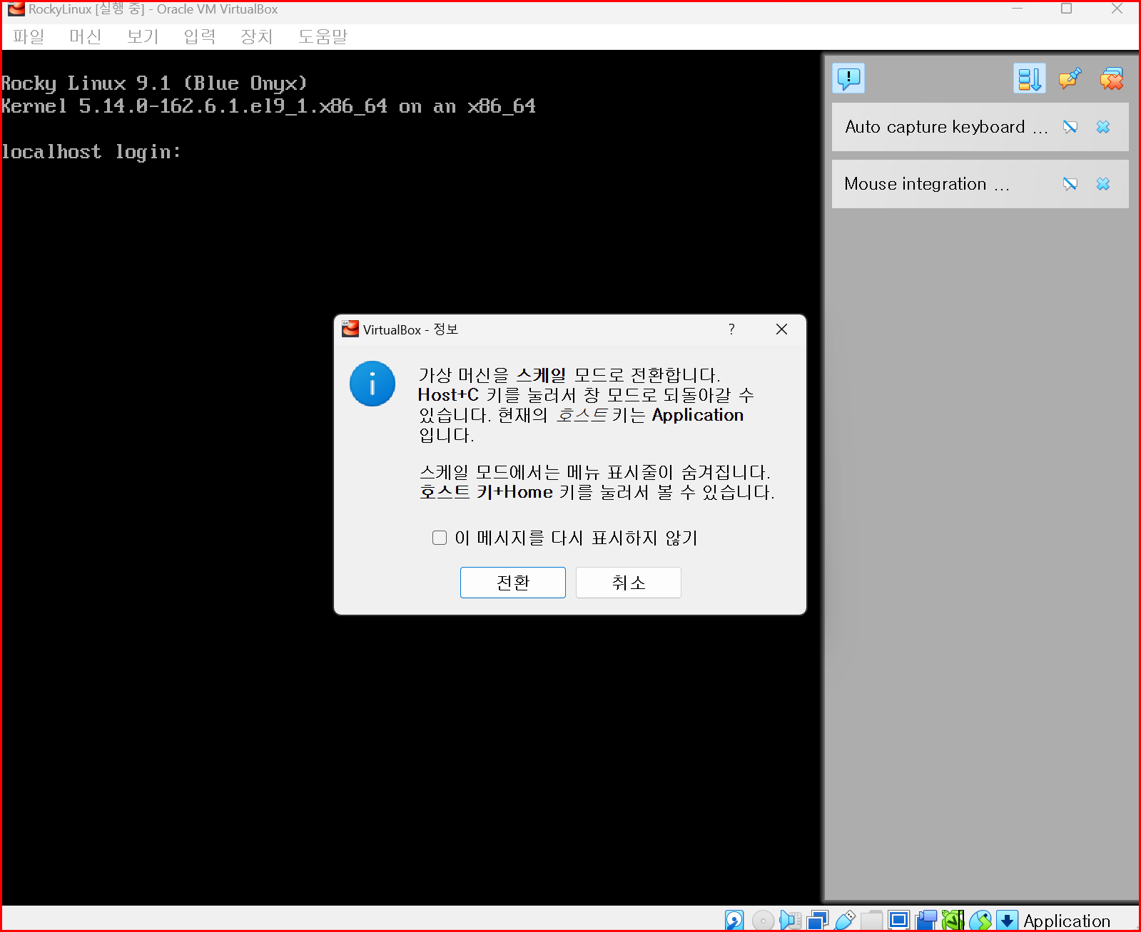 '크기 조정 모드'에서는 메뉴가 사라집니다. 다시 원래 상태로 돌아갈 때는 '호스트 키'를 누른 상태에서 'C'키를 누릅니다. 메뉴가 아닌 단축키로 '크기 조정 모드'를 들어갈 때는 '호스트 키 + C'로 진입이 가능한데 다음과 같은 알림 창이 뜹니다. 알림 창이 귀찮으면 '이 메시시를 다시 표시하지 않기'를 선택하면 됩니다.