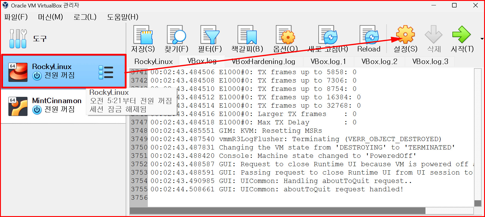 마우스 변경이 필요한 가상 머신이 선택된 상태에서 상단에 있는 '설정' 버튼을 클릭합니다.