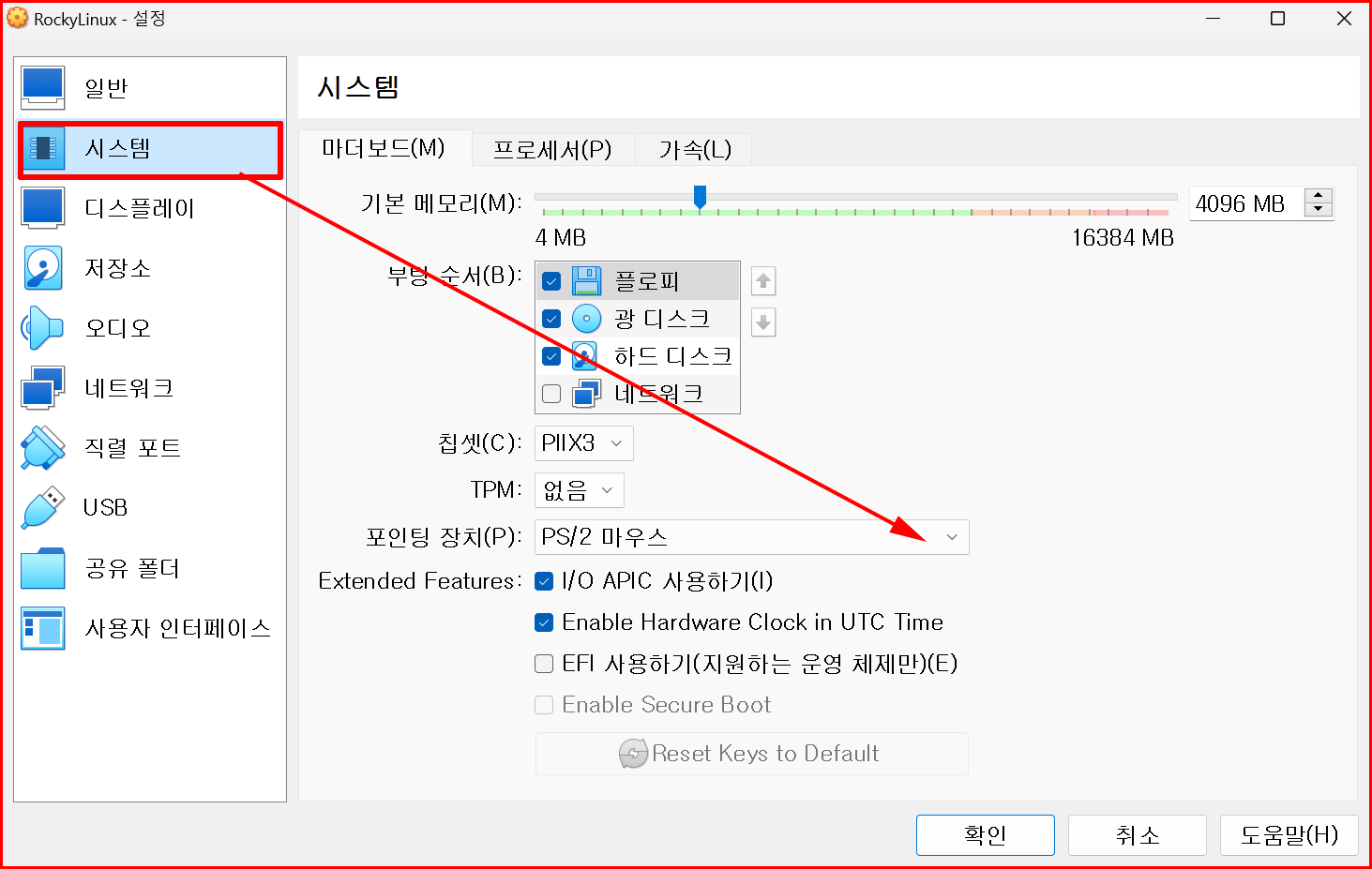 '설정'을 클릭하면 아래와 같은 대화창이 나옵니다. 두 번째 '시스템'을 선택하여 포인팅 장치 'PS/2 마우스' 오른쪽 아래 화살표를 내리면 'USB 태블릿'으로 변경할 수 있습니다.