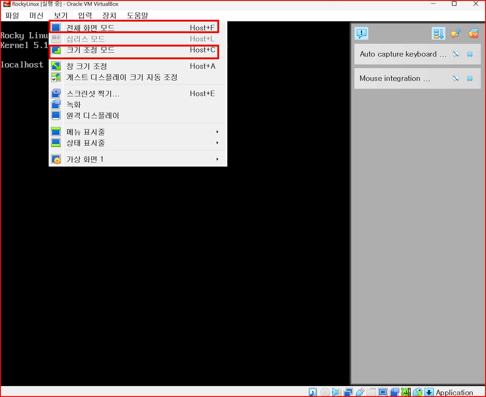 가상 머신이 실행된 상태에서 창 모드를 변경할 수 있습니다. '전체 화면 모드'와 '크기 조정 모드'입니다. '전체 화면 모드'는 호스트 컴퓨터의 전체 화면을 사용하는 것입니다. 단축키는 '호스트 키와 F'를 동시에 누르면 됩니다.