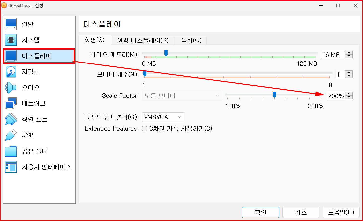 가상 머신의 창도 '디스플레이'를 선택하여 변경할 수 있습니다.