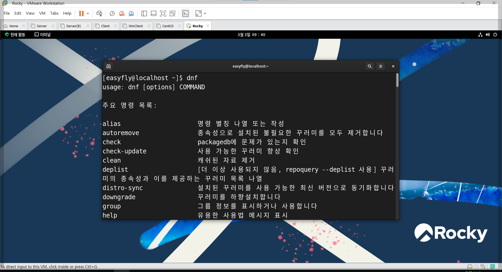 | 패키지 설치 | dnf install <패키지> | rpm -i <패키지>.rpm |