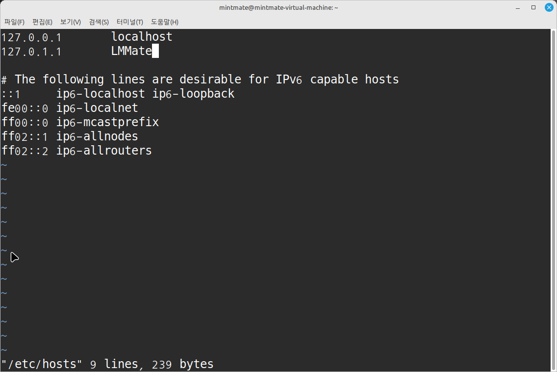 127.0.1.1 줄에서 기존 호스트 이름을 LMMate로 바꿔주세요.