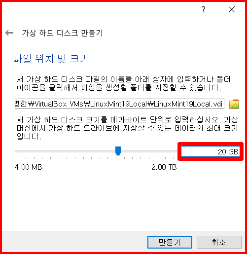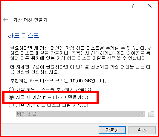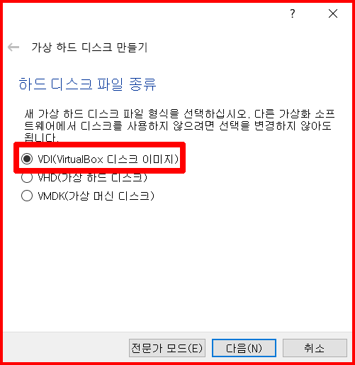 하드디스크 종류는 VDI, 즉 VirtualBox 디스크 이미지가 되겠습니다.