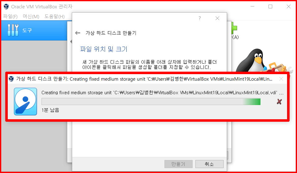 속도가 필요한 실습 과제라면 디스크 크기를 고정하는 것이 좋습니다. 물론 경제적으로는 '동적 할당'이 좋겠으나 커널 컴파일 등을 위해서는 속도가 빠른 '고정 크기'를 선택합니다.