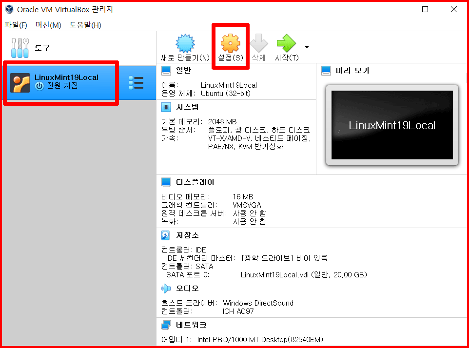 버츄얼박스 환경을 설정합니다. '설정' 버튼을 선택합니다. 디스플레이 설정을 통해 해상도를 늘릴 수도 있습니다. 그러나 콘솔 작업이 많기 때문에 기본 옵션대로 진행합니다.