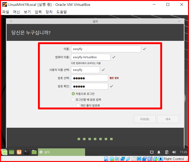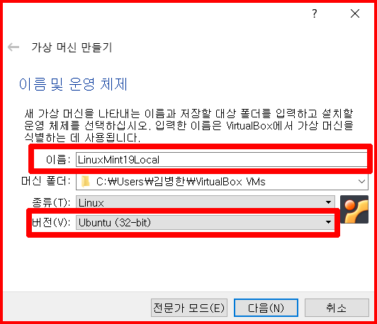 저는 버츄얼박스를 추가했습니다. '사용자 이름'은 리눅스 시스템 사용자로 로그인 주체가 됩니다. 홈디렉토리에 '사용자 이름'의 디렉터리가 생성되고 사용 환경도 구성됩니다.