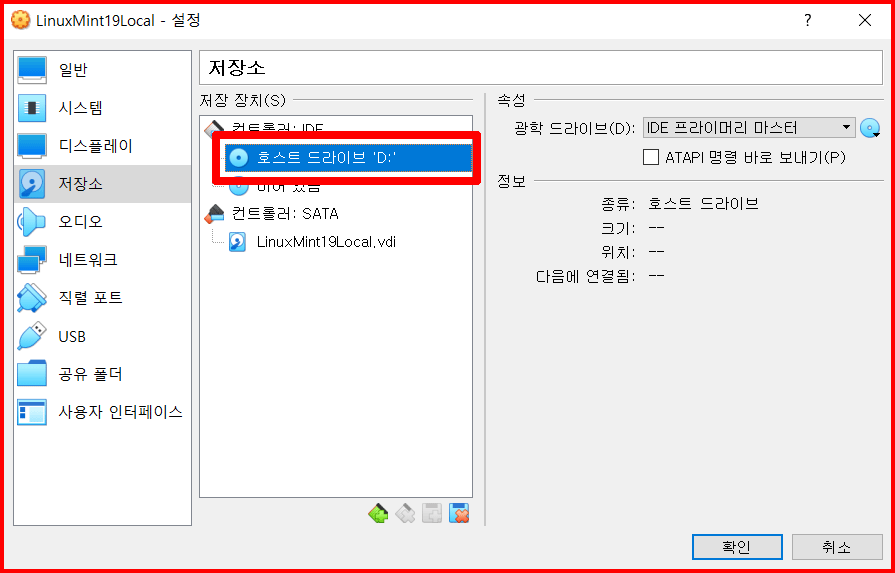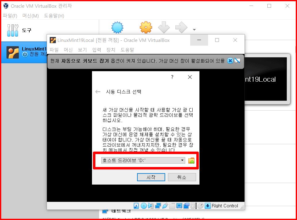 이미지 파일을 사용하는 경우와 광디스크를 사용하는 것은 경우가 다릅니다. 호스트의 저장소를 공유하여 부팅을 할 수 있습니다. 저의 경우는 이미 만들어진 디스크를 호스트 컴퓨터 DVD 드라이브에 넣고 시작을 했습니다.