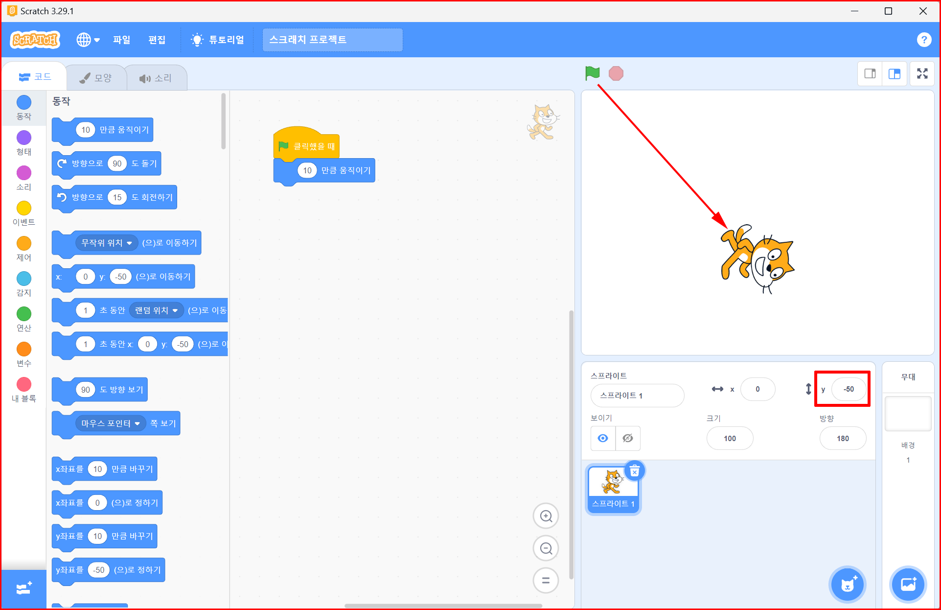 위 상태는 깃발 클릭하기 전입니다. 클릭을 하면 보고 있던 방향으로 10만큼 움직이게 됩니다. 깃발을 연거퍼 5번 클릭했더니 고양이가 아래로 50만큼 이동했습니다. 아래 스프라이트 영역에는 고양이 좌표가 나옵니다. x좌표는 변함이 없고, y좌표가 -50이 됐습니다.