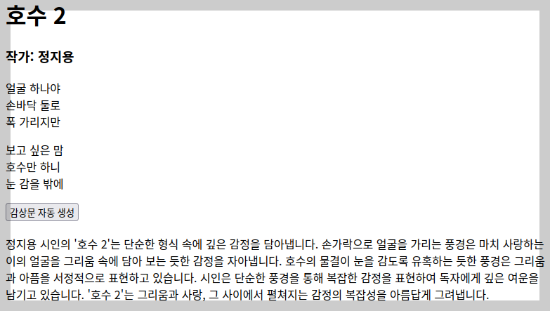 즉, 지금은 '시 + 감상문' 기초 서비스 뼈대를 갖춘 상태입니다.