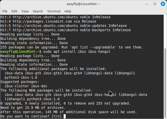 한글을 설치하기 위한 apt install은 Debian 계열 리눅스에서 패키지를 설치할 때 사용하는 명령어입니다. 저장소에서 원하는 소프트웨어와 그에 필요한 의존성 패키지를 자동으로 찾아 설치합니다. 여기서는 'sudo apt install ibus ibus-hangul'로 한꺼번에 설치합니다. ibus는 입력기 프레임워크, ibus-hangul은 한글 입력 모듈입니다. sudo는 관리자 권한으로 실행함을 의미합니다.