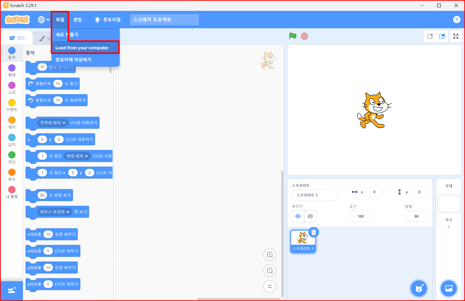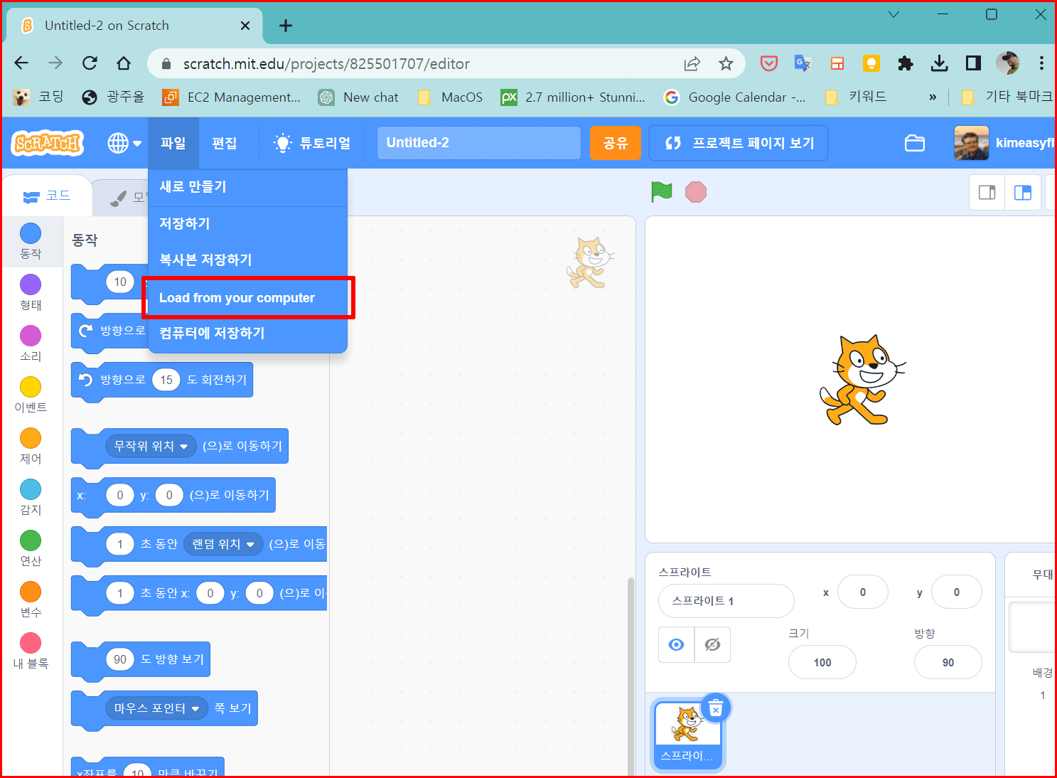 스크래치는 온라인 버전과 오프라인 버전이 있습니다. 오프라인 버전은 자신의 컴퓨터에서 로그인 없이 바로 실행하여 파일 형태로 보관하여 사용합니다. 온라인에서 오프라인 파일을 불러올 때는 브라우저에서 파일 메뉴를 열고 앞서 학습했던 내용과 동일하게 파일을 불러오면 온라인에서 계속 작업할 수 있습니다.