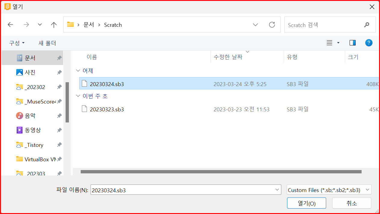 전 시간에 작업했던 파일을 불러오도록 합니다. 파일 탐색기가 열리면서 파일을 찾을 수 있습니다. 제 경우는 '문서' 폴더에 'Scratch' 폴더를 만들어 보관 중입니다. 해당 파일을 열고, '열기' 버튼을 클릭합니다.
