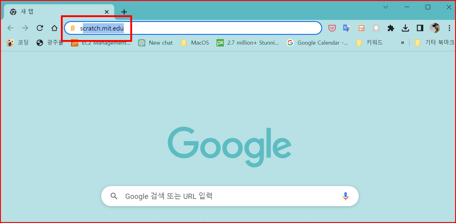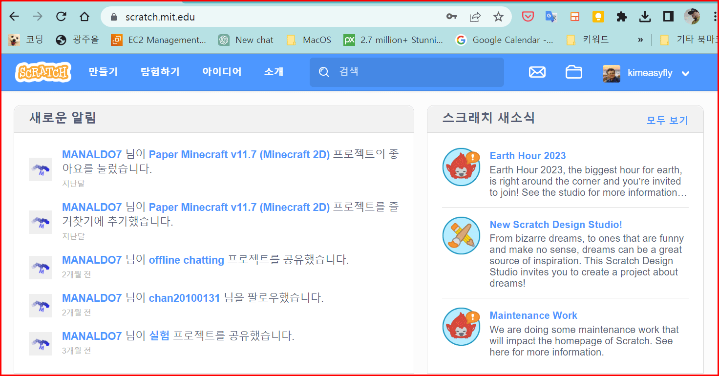 온라인에서 스크래치 연결할 때는 브라우저에서 주소(scratch.mit.edu)를 입력하고 로그인하여 시작합니다. 자신의 결과물은 클라우드 서비스로 진행합니다.