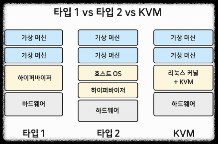 이 그림을 보면 KVM이 타입 2처럼 보일 수 있지만, 실제로는 리눅스 커널이 하드웨어를 직접 제어하는 타입 1 구조라는 점이 핵심입니다.