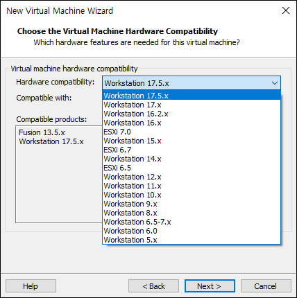 - Hardware compatibility: 기본값은 Workstation 17.x
