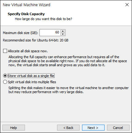 - “Store virtual disk as a single file” (단일 파일) 또는