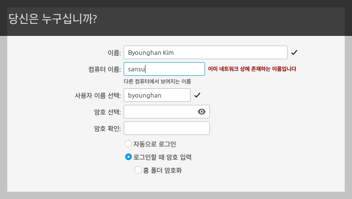 | 사용자 이름 선택 | 시스템 로그인에 사용될 사용자 계정 이름입니다. 예: byounghan※ 홈 디렉터리(/home/byounghan) 이름에도 사용됩니다. |