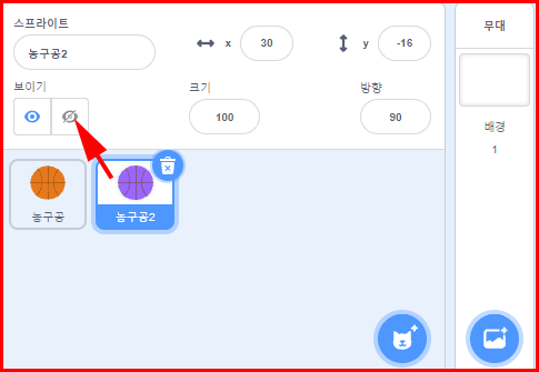 '농구공2' 는 숨겨 보도록 하겠습니다. 숨길 스프라이트를 선택하고 위에 있는 눈동자 아이콘 중에서 빗금 친 아이콘을 선택하면 스프라이트는 숨겨집니다.