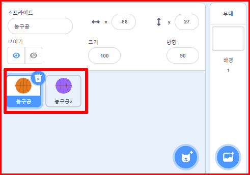 이름도 변경할 수 있습니다. 위 스프라이트의 이름을 한글로 '농구공'과 '농구공2'로 변경하도록 하겠습니다. 변경 방법은 스프라이트가 선택된 상태에서 위 속성을 변경하면 됩니다.