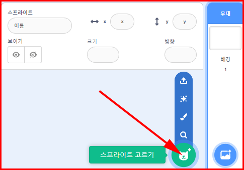스프라이트 영역 우하단에 고양이 아이콘을 선택하면 '스프라이트 고르기'가 시작됩니다.