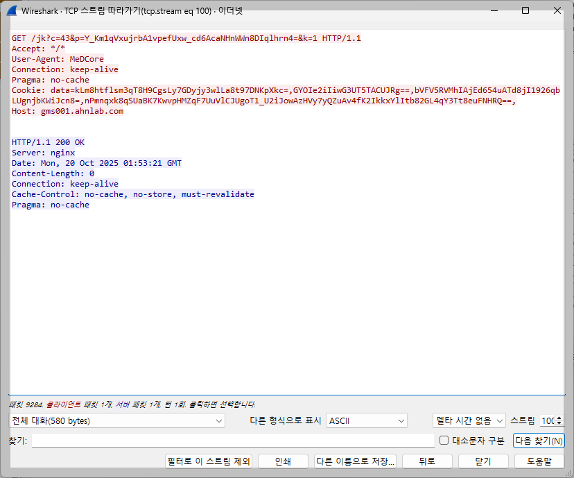 - 새로운 창이 뜨면서 클라이언트(내 PC)와 서버가 주고받은 요청과 응답 메시지 전체를 대화 형식으로 보여줍니다. 이를 통해 어떤 데이터를 주고받았는지 쉽게 파악할 수 있습니다.