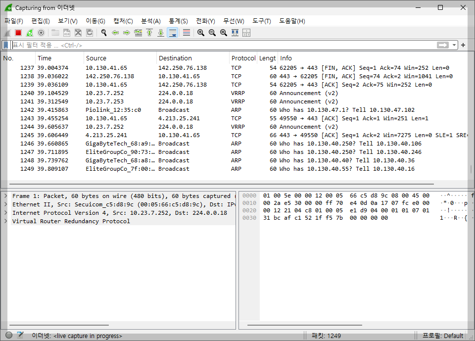 패킷 캡처가 시작되면 화면에 실시간으로 데이터가 쏟아집니다. 와이어샤크의 기본 화면은 크게 세 부분으로 나뉩니다.