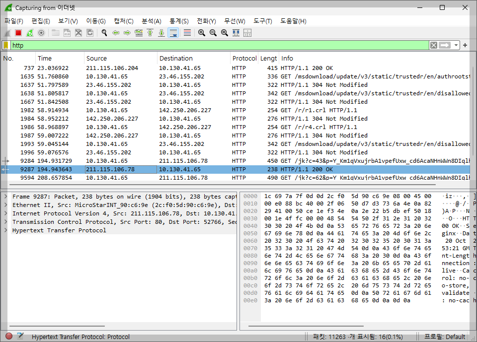 - 패킷 바이트 창 (Packet Bytes Pane): 패킷의 실제 데이터 값을 16진수(Hex)와 아스키(ASCII) 코드로 보여줍니다.