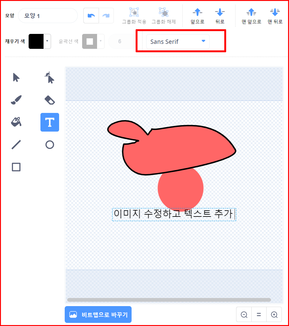 이미지에 텍스트를 추가할 수 있습니다. 도구 박스에서 텍스트(T)를 선택하여 글자를 입력할 수 있습니다. 채우기 색에 의해 글자 색을 결정할 수 있습니다. 또한 글자 폰트도 고를 수 있으나 한글에 적용되는 것은 많지 않습니다.