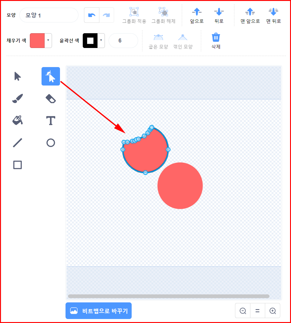 '그리기'를 선택하면 스프라이트 그리기 모드로 진행됩니다. 편집 영역의 '코드'에서 '모양'으로 변경되면서 그릴 수 있는 준비가 됩니다. 왼편에 툴박스가 나타나며 원하는 툴을 선택하여 그림을 그리면 됩니다. 기본 도형 형식은 벡터 이미지입니다. 백터 이미지는 점과 선, 그리고 면을 계산을 통해 만들어지는 이미지입니다. 픽셀 단위로 만들어지는 레스터 이미지에 비해 선이 깔끔하고 확대하더라도 변형이 없습니다. 벡터 이미지를 레스터 이미지(비트맵)로 바꿀 수 있습니다.