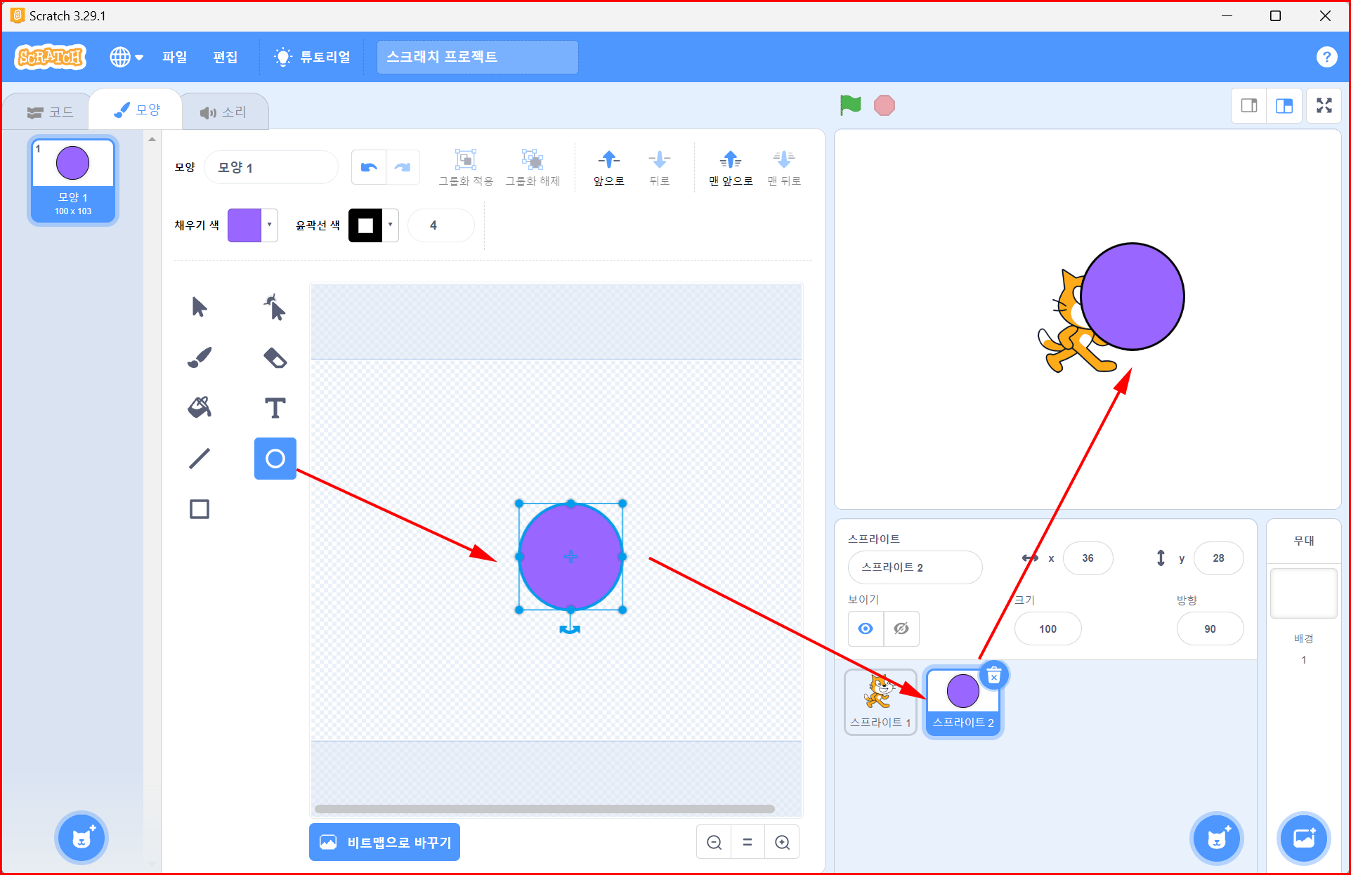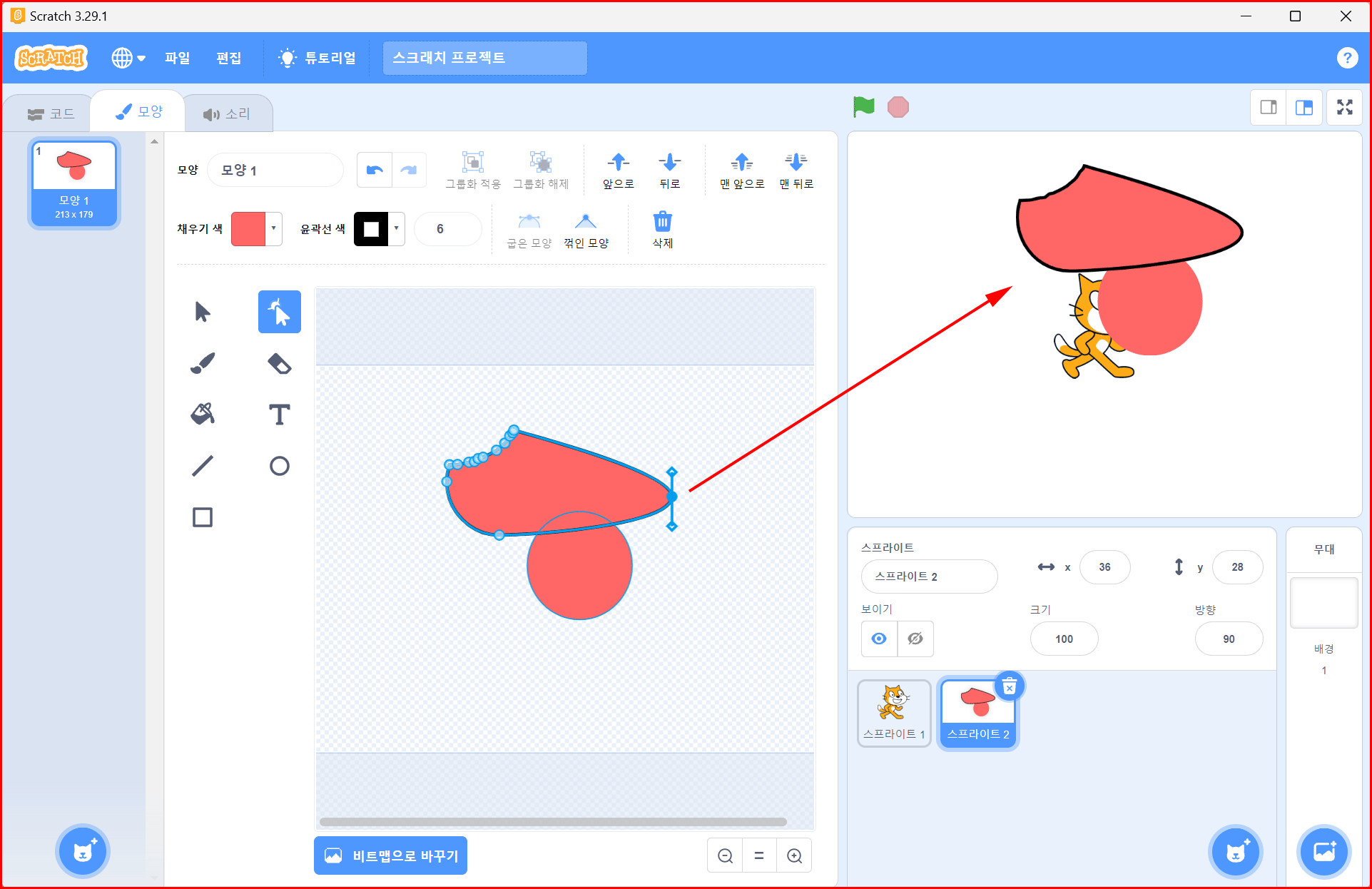 만들어진 이미지는 바로 무대에 반영됩니다. 물론 스프라이트 이름도 변경할 수 있고 위치도 바꿀 수 있습니다. 만들어진 스프라이트 크기도 조정이 가능합니다.