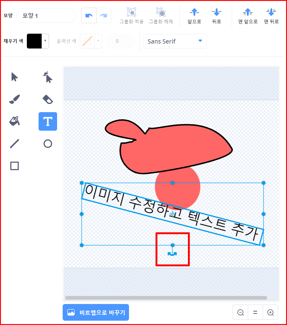 추가한 글씨는 확대하거나 축소할 수 있습니다. 벡터 이미지이기 때문에 작성된 글자를 선택해서 네 귀퉁이 조절점으로 확대할 때는 밖으로 축소할 때는 안으로 드래그합니다. 글자를 회전할 때는 아래 가운데 생긴 조절점을 이용하여 원하는 각도를 줄 수 있습니다.