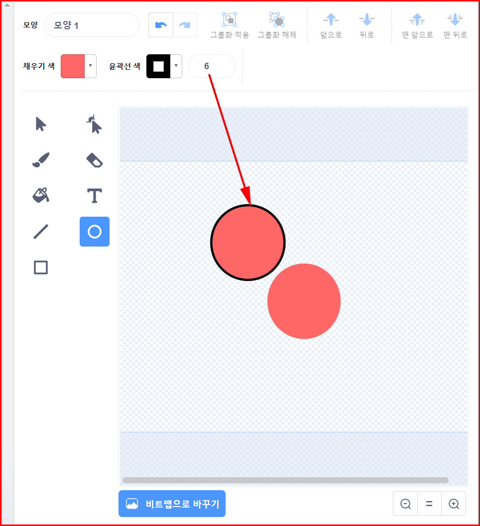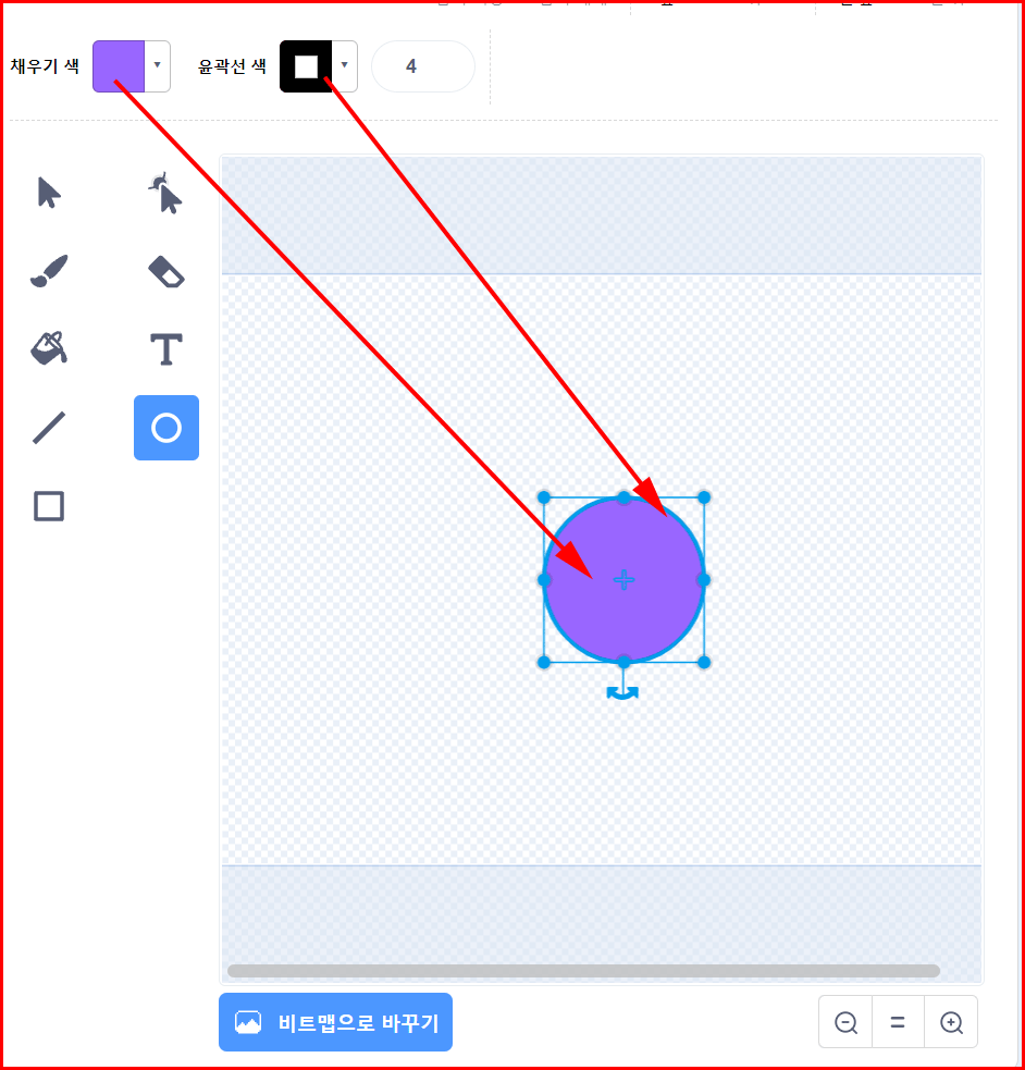 툴박스에서 원을 선택하여 그려 봅니다. 원의 색의 '채우기 색'으로 채워집니다. 테두리는 '윤곽선 색'으로 결정됩니다.