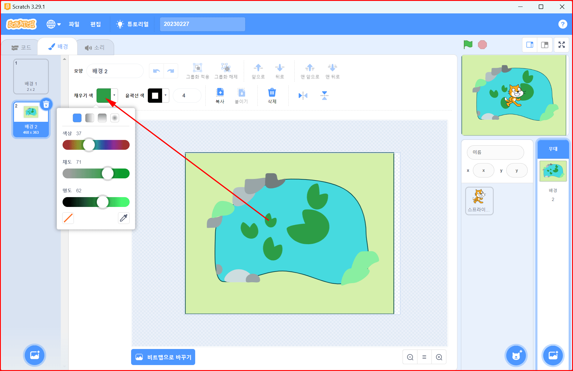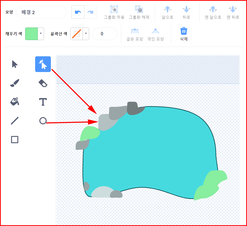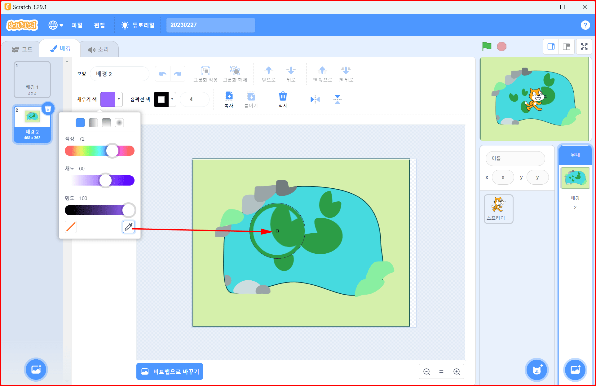 연못 안에 연잎파리도 만들어 봅니다. 원과 임의 조정 도구를 사용하여 크고 작은 잎을 그립니다. 배경을 그리고 있기 때문에 스프라이트는 배경 위에 있게 됩니다.