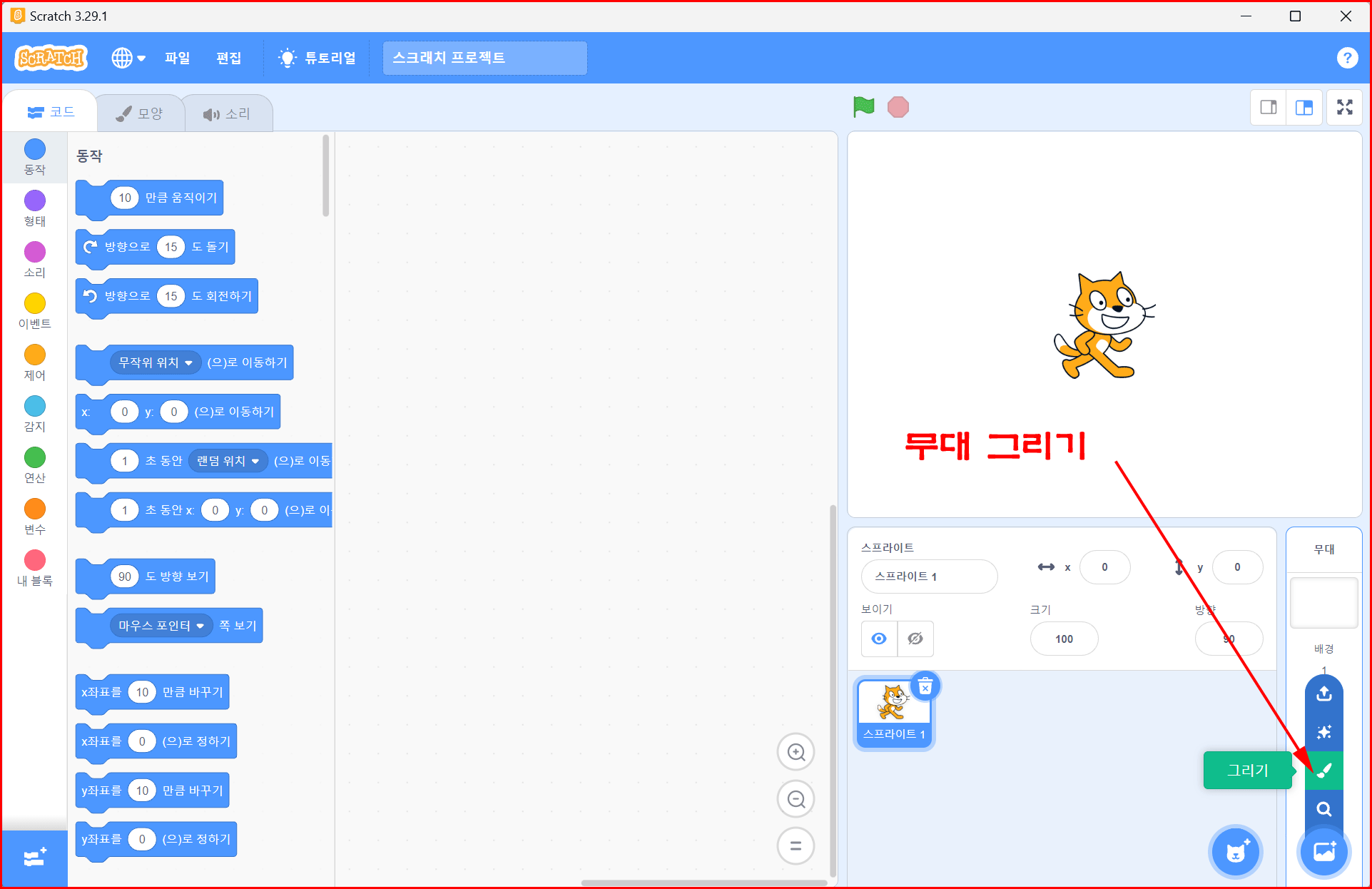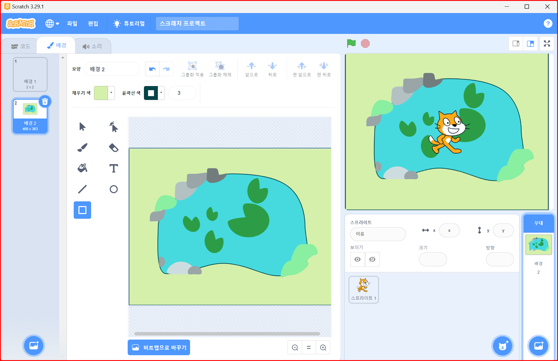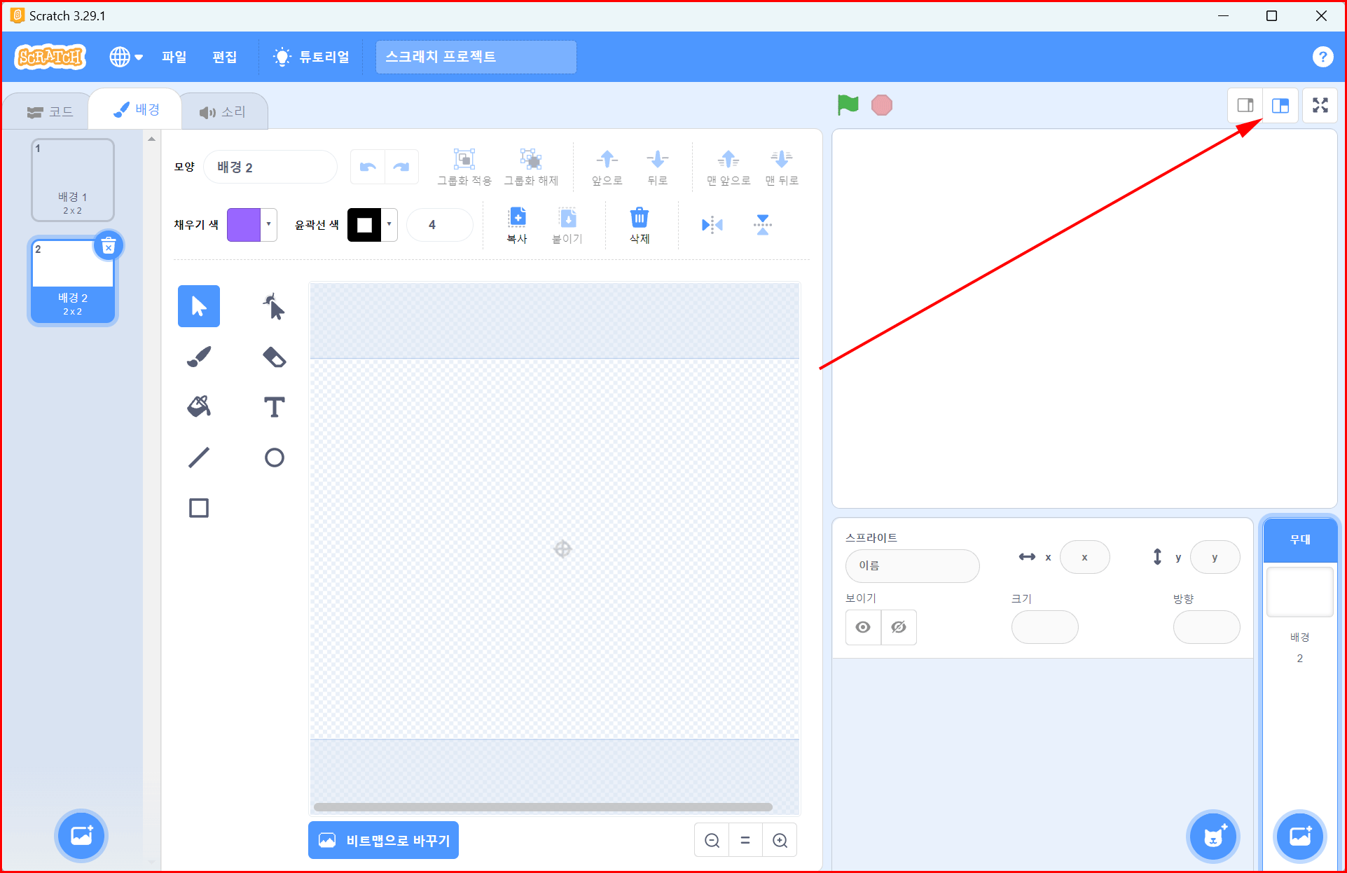 스프라이트를 직접 그려 사용할 수 있듯이 무대도 직접 그릴 수가 있습니다. 스프라이트 옆에 조그맣게 자리한 '무대 영역'에 아이콘을 선택하면 올라오는 아이콘 중에 '그리기'가 있습니다.