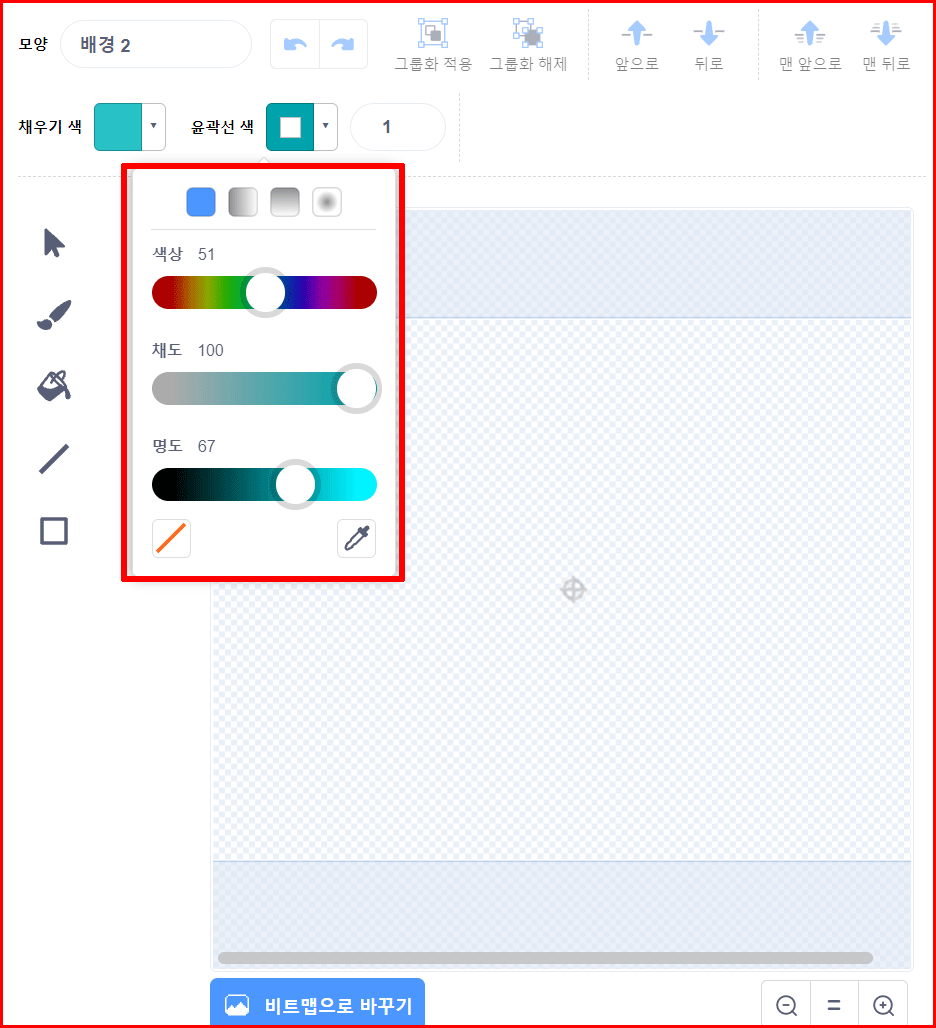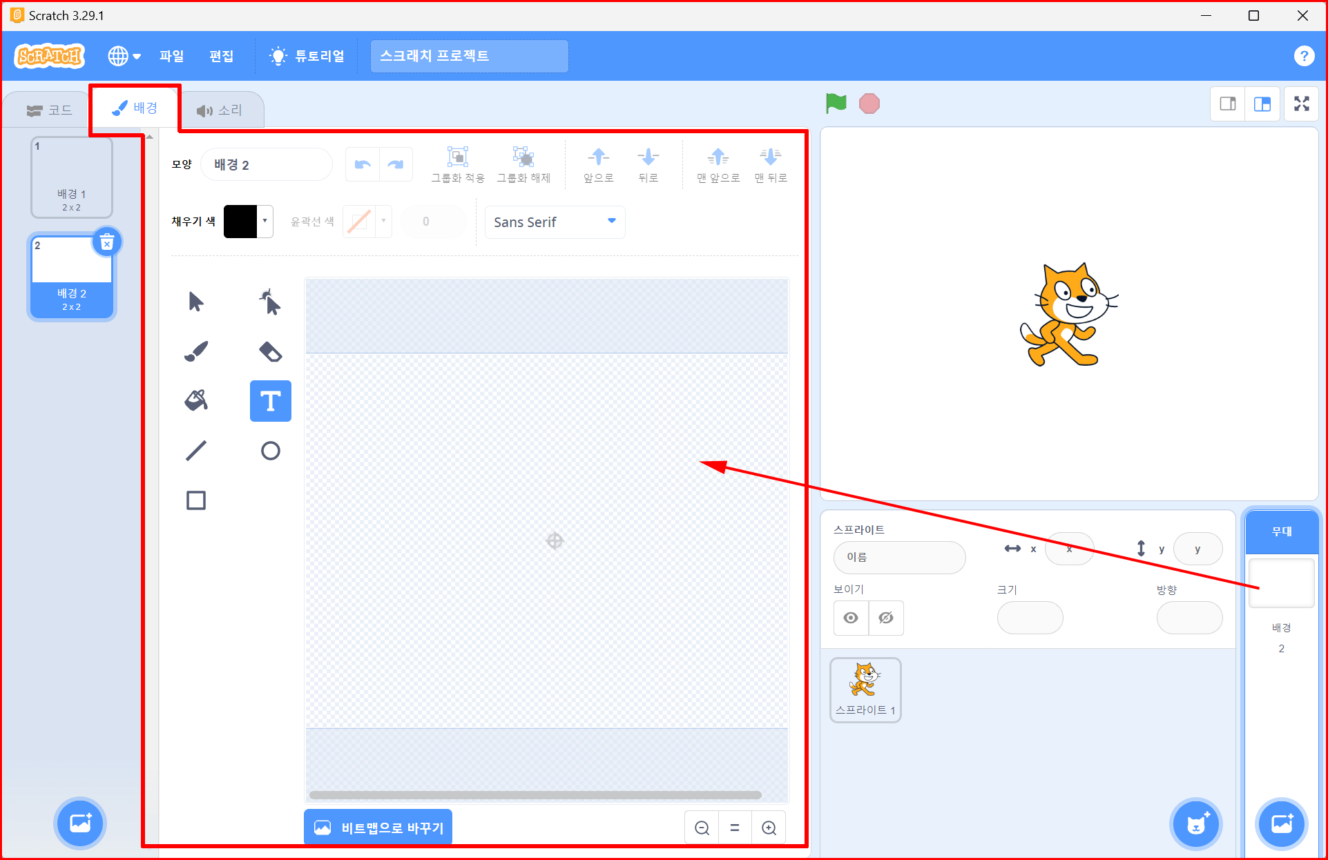 '그리기' 아이콘 선택과 동시에 올라오는 배경 편집기는 스프라이트 편집기와 비슷한 것 같지만 다른 점이 있습니다. '탭'의 이름이 '모양'이 아니고 '배경'입니다. 스프라이트는 '모양'을 편집했다면, 이번에는 '배경'을 편집하기 때문입니다.