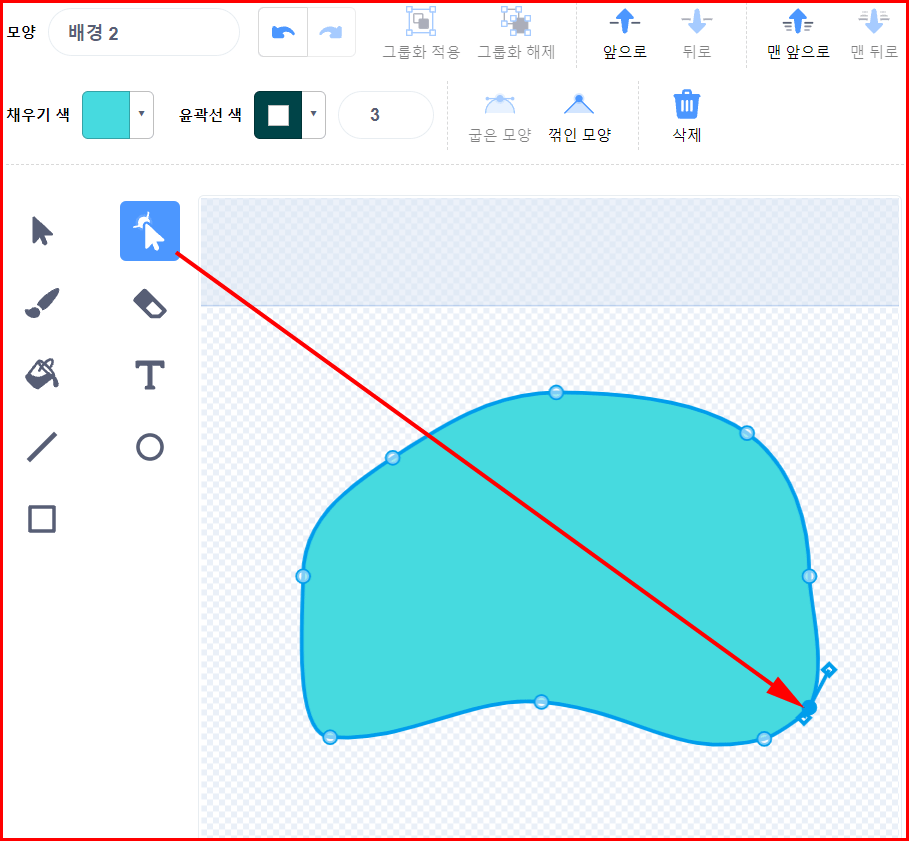 모양을 부분적으로 바꿀 때는 위에 표식 달린 화살표를 선택하여 조절점을 클릭하여 조정합니다. 조정점이 필요하면 테두리 선을 클릭하면 조절점이 생기면서 조정이 가능해집니다.