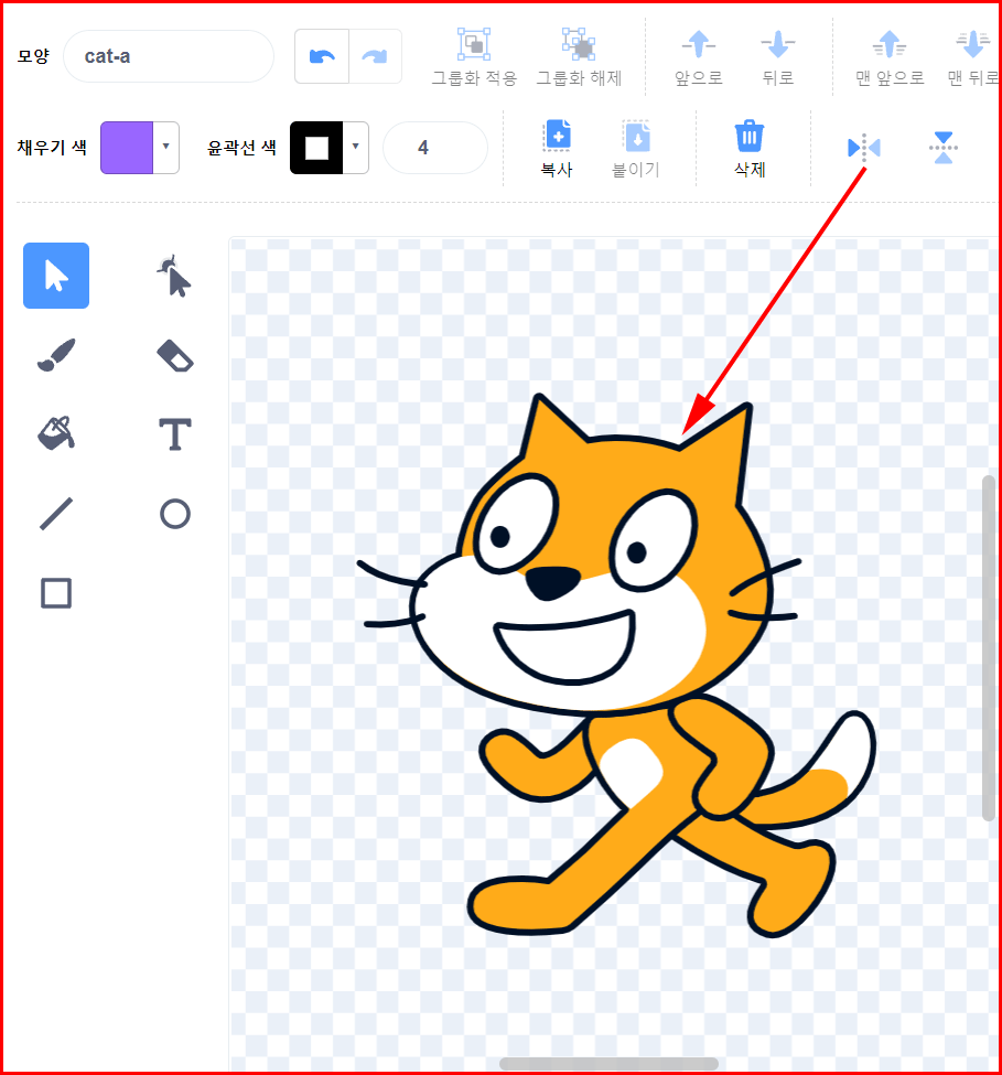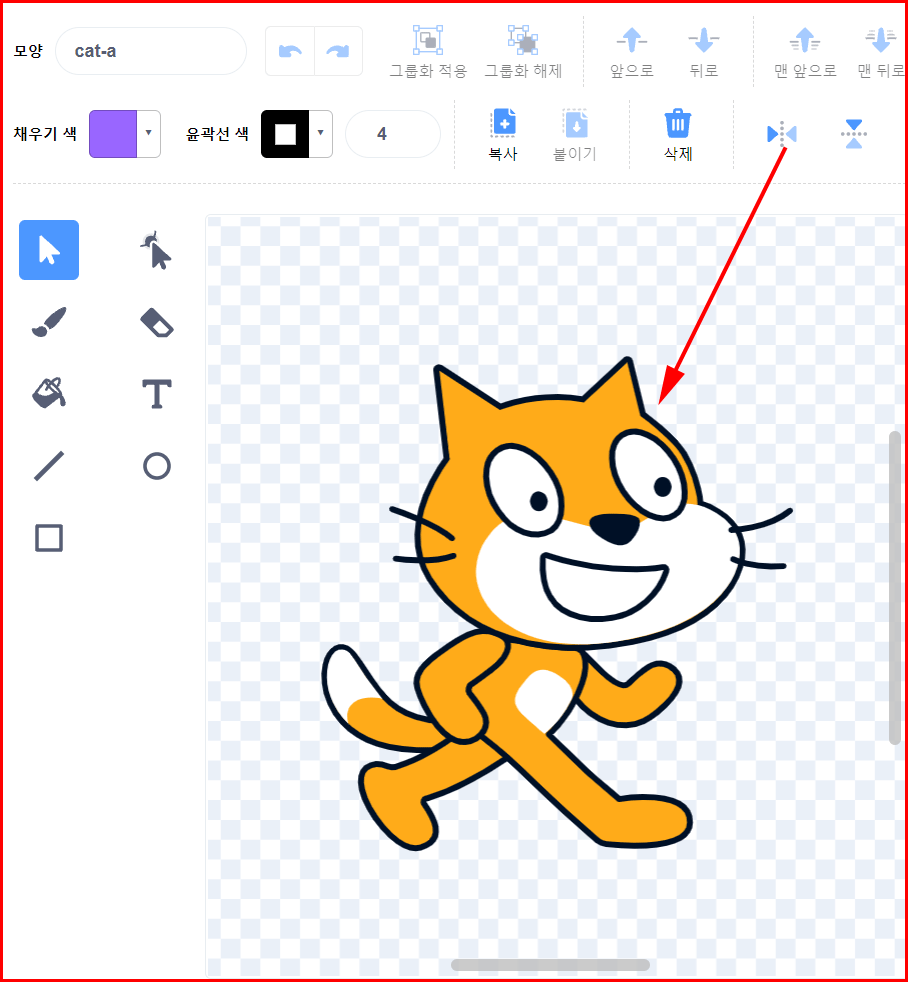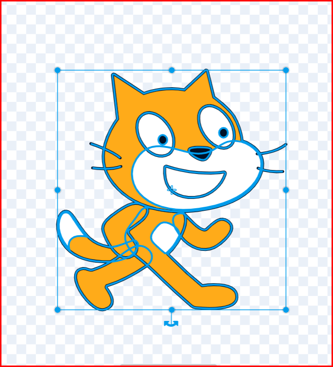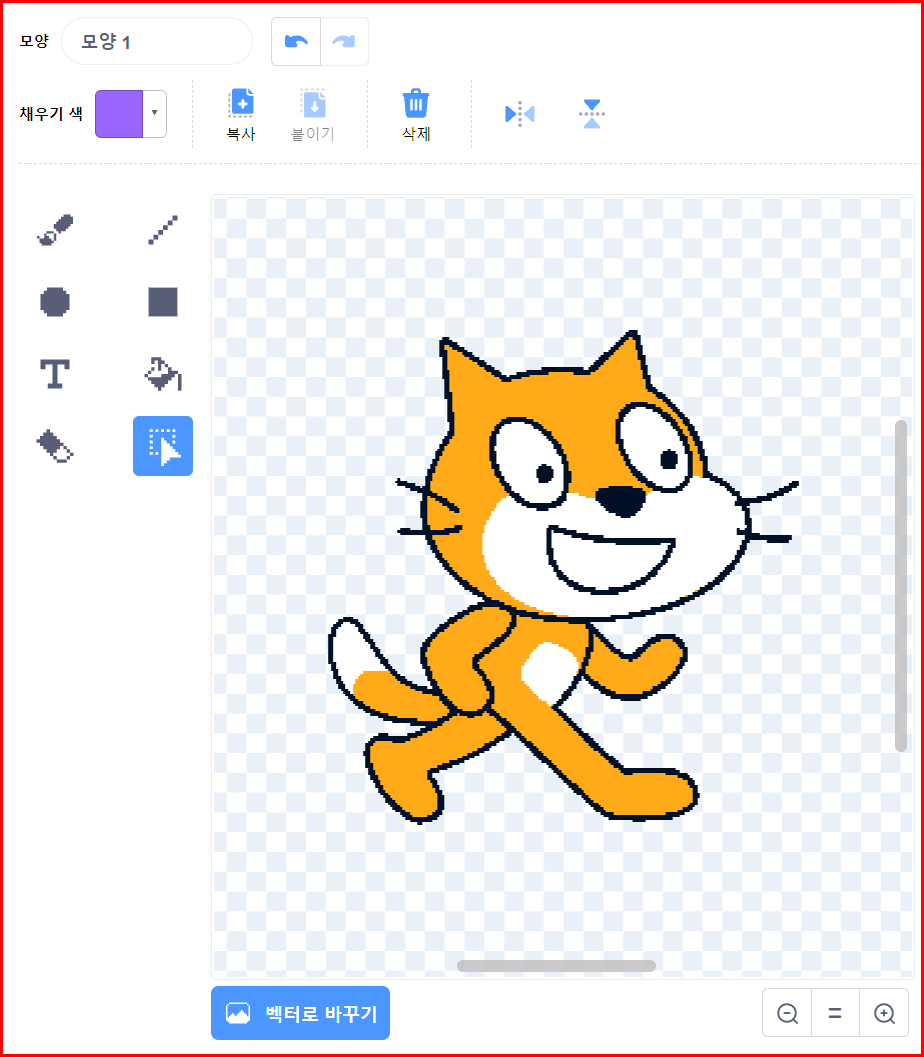 스프라이트 전체를 선택한 상태에서 모서리 조절점을 이용하여 확대하거나 축소할 수 있습니다. 물론 벡터 이미지는 확대하거나 축소해도 외곽선이 깨지지 않습니다.