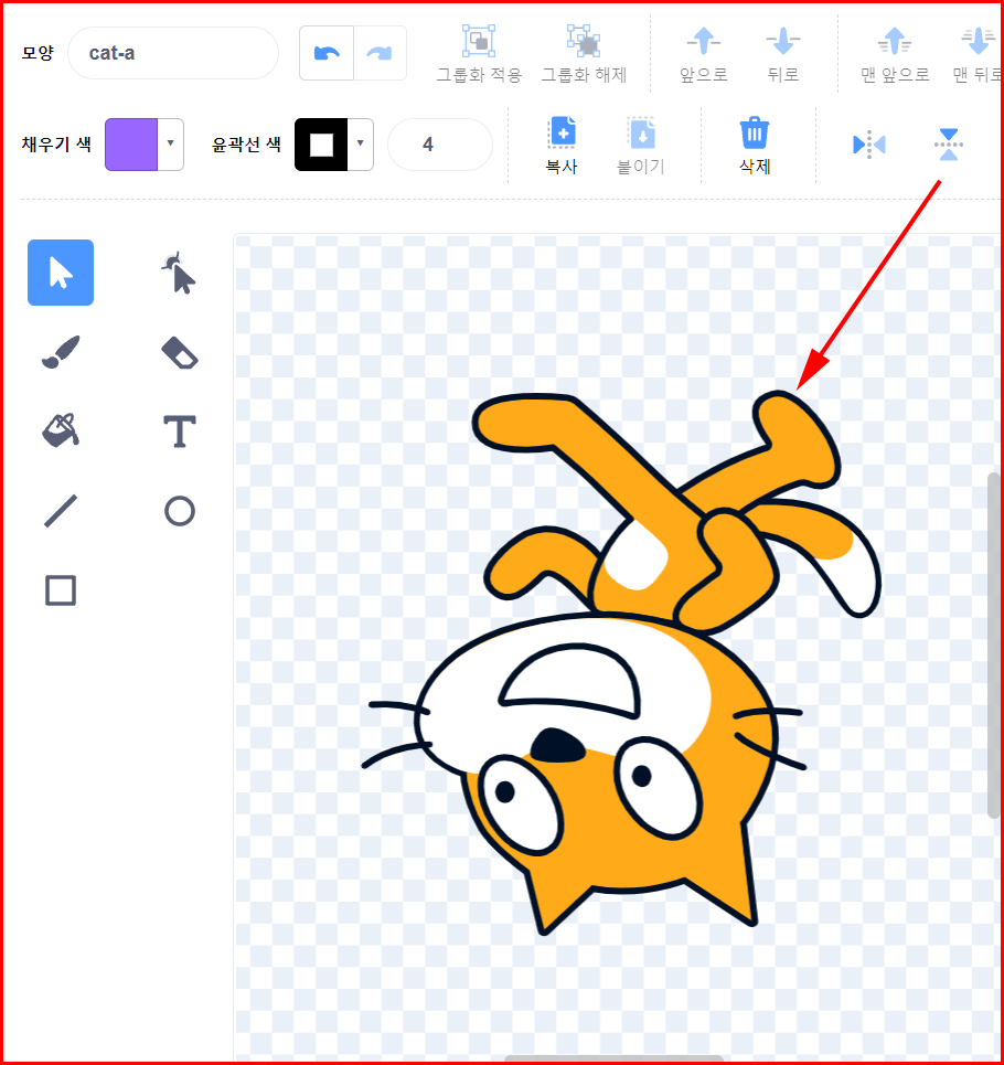 스프라이트 전체를 선택한 상태에서 모서리 조절점을 이용하여 확대하거나 축소할 수 있습니다. 물론 벡터 이미지는 확대하거나 축소해도 외곽선이 깨지지 않습니다.