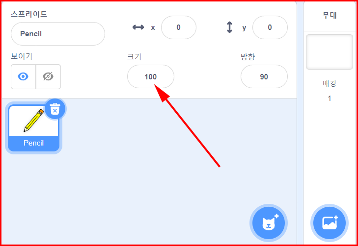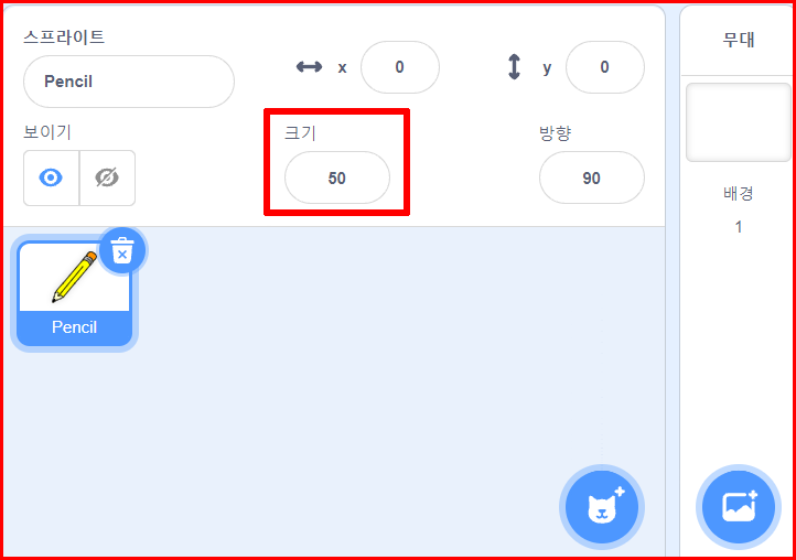 스프라이트는 'Pencil'을 선택합니다. 어떤 스프라이트를 선택해도 무방하지만 여기서는 '연필'을 선택했습니다. 선택하는 방법은 스프라이트 중에서 고르면 됩니다.