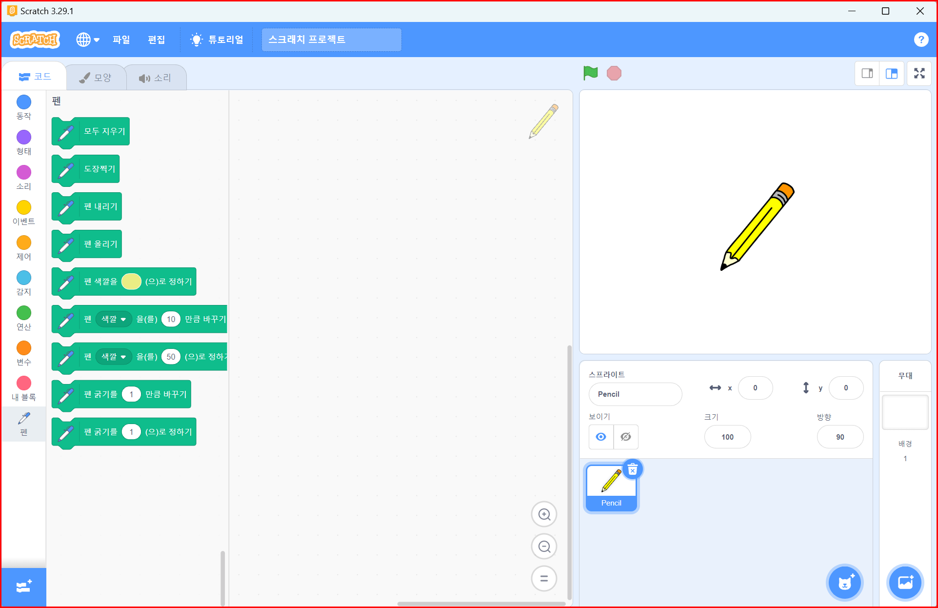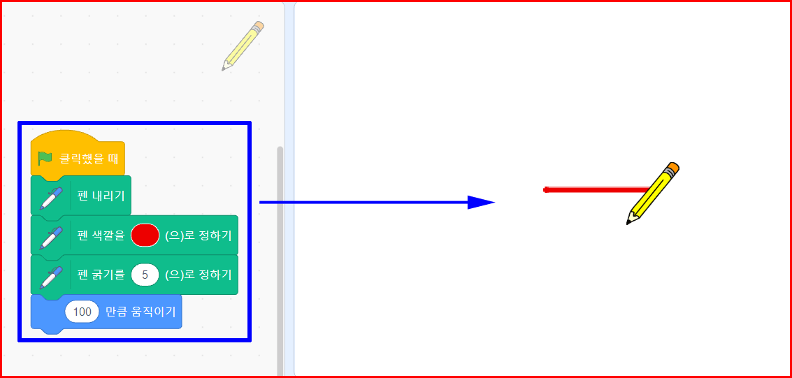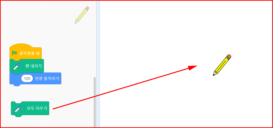 '깃발'을 클릭하면 펜을 내리고 100만큼 움직이라는 코딩입니다. '펜 내리기'는 펜을 종이에 내린다는 의미입니다. 즉 그리겠다는 얘기입니다. 그런데, 이상하지 않습니까? 선분이 연필촉이 있는데서 그려지는 것이 아니고 연필 중간에서 그려지고 있습니다. 이유는 스프라이트 중심이 객체의 한가운데이기 때문입니다.