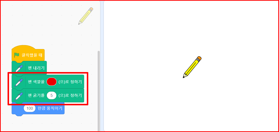 펜의 색이나 굵기를 변경할 수 있습니다. '펜 색깔을 ( )으로 정하기'에서 색을 지정합니다. 또한 '펜 굵기를 ( ) 만큼 바꾸기'를 통해 선의 굵기를 바꿀 수 있습니다.