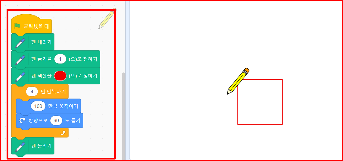 '깃발'을 클릭하면 '펜 내리기'로 그릴 준비를 하고 펜 굵기와 색을 선택한 뒤에 4번 반복합니다. 한 변이 100인 정사각형을 만드는 것은 100만큼 움직이고 90도 돌기를 하면 정사각형이 만들어집니다. 정삼각형 같으면 3번 반복을 하는데, 각도를 120도를 틀어주면 됩니다.