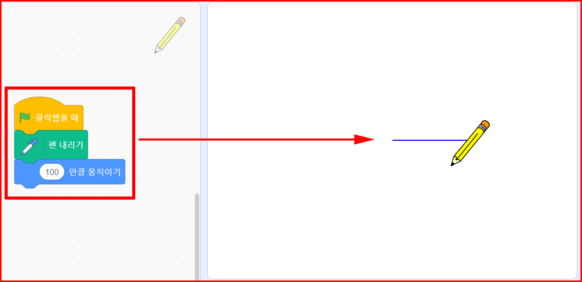 '깃발'을 클릭하면 펜을 내리고 100만큼 움직이라는 코딩입니다. '펜 내리기'는 펜을 종이에 내린다는 의미입니다. 즉 그리겠다는 얘기입니다. 그런데, 이상하지 않습니까? 선분이 연필촉이 있는데서 그려지는 것이 아니고 연필 중간에서 그려지고 있습니다. 이유는 스프라이트 중심이 객체의 한가운데이기 때문입니다.