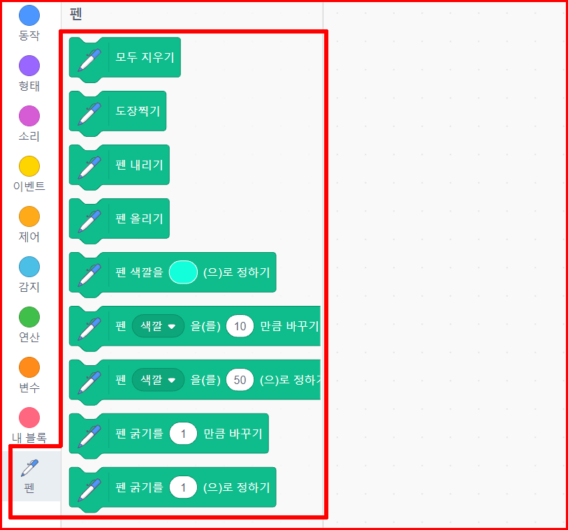 펜 블록으로 스프라이트가 움직이는 자국을 선으로 그릴 수가 있습니다. '펜 내리기'와 '펜 올리기'로 펜을 사용할 수 있으며, 펜으로 그린 선을 '모두 지우기' 블록을 이용하여 지울 수도 있습니다.