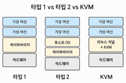 하이퍼바이저 타입 1 vs 타입 2 그리고 KVM 구조위 그림은 가상화 기술의 세 가지 대표 구조를 한눈에 비교한 것입니다. 각각의 차이를 이해하면, 어떤 환경에서 어떤 하이퍼바이저를 선택해야 할지 명확해집니다.1. 타입 1(베어메탈형) 하이퍼바이저왼쪽 구조가 타입 1입니다.구성: 하드웨어 → 하이퍼바이저 → 가상 머신하이퍼바이저가 하드웨어 위에서 직접 실행되며, 그 위에 여러 가상 머신이 동작합니다.특징:성능과 안정성이 뛰어남서버 가상화, 클라우드 환경에서 많이 사용예: VMware ESXi, Microsoft Hyper-V, Xen2. 타입 2(호스트형) 하이퍼바이저가운데 구조가 타입 2입니다.구성: 하드웨어 → 호스트 OS → 하이퍼바이저 → 가상 머신기존 운영체제 위에서 하이퍼바이저 프로그램을 설..