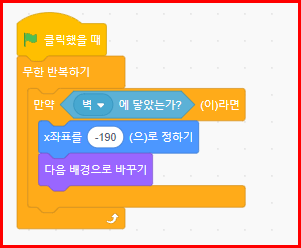 스프라이트 '곰'이 벽에 닿으면 원래 위치로 옮기고 배경을 '다음 배경'으로 바꾸기를 합니다. 이 과정은 무한 반복하기 때문에 정지 버튼을 누르기 전까지는 계속 배경이 바뀝니다.