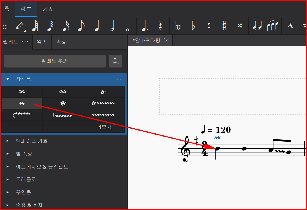 장식음도 팔레트를 추가하여 사용해야 합니다. '장식음' 팔레트를 열어두고 장식할 원음을 선택합니다. 해당 장식음을 클릭하면 원음 위에 장식음 표식이 추가됩니다.