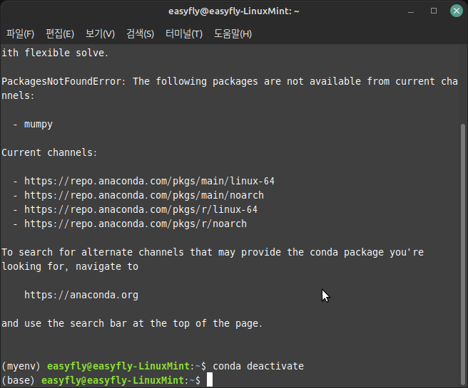 4. 환경 비활성화: 환경을 비활성화하려면 다음 명령을 실행합니다.