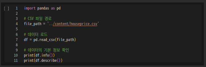 이 코드에서는 먼저 pandas 라이브러리를 불러오고, CSV 파일 경로를 설정한 후, 해당 경로에서 데이터를 불러옵니다. 이후 데이터의 기본 정보를 출력하여 데이터의 구조를 파악합니다.